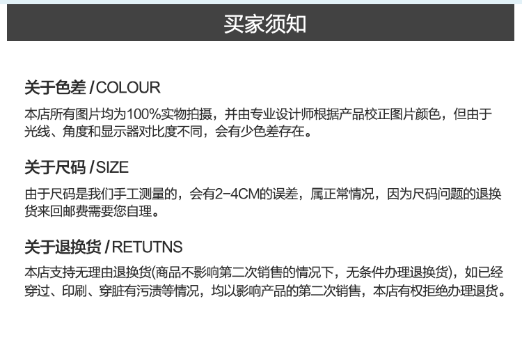 定制類服裝提供修改尺寸服務(wù)。